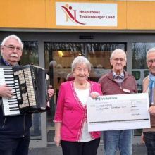 In der Weihnachtszeit sammelte der Awo-Singkreis bei Proben und festlichen Adventsfeiern eine Spende von 350 Euro. Diese Summe war für das Hospizhaus Tecklenburger Land bestimmt. Den symbolischen Spendenscheck überreichten Marianne Hoppe, Hans-Georg Becker und der Leiter des Singkreises, Hans Happe, an den Geschäftsführer Alois Beulting.