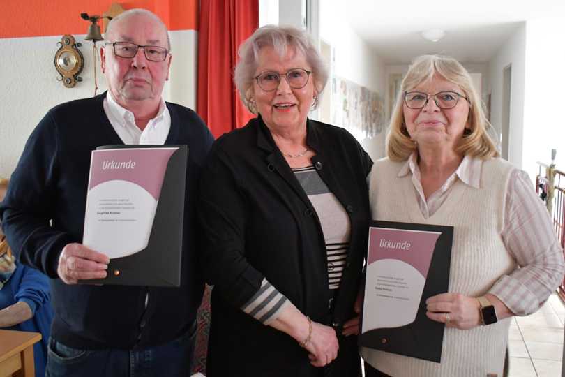 Bereits zum Jahresende hatte Siegfried Kremer sein Amt als Vorsitzender aus gesundheitlichen Gründen aufgegeben. Im Jahr 2010 war er in die AWO eingetreten und hatte dort ab 2018 als Vorsitzender Verantwortung übernommen. Auch seine Frau Conny Kremer war jahrelang ehrenamtlich im Vorstand aktiv; sie gab ihr Amt ebenfalls auf. Neben einem Dankeschön und kleinen Geschenken vom Nachfolger Andreas Rolke ehrte auch die AWO-Kreisvorsitzende Gerda Stiller das Ehepaar Kremer auf ganz besondere Weise: Urkunden und Nadeln bezeugen das langjährige ehrenamtliche Engagement der beiden.