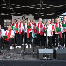Gut gestärkt konnten sich die Chöre anschließend ihren Auftritten widmen. Den Auftakt machten „Groove and Joy“ unter der Leitung von Thomas Simmet am Piano. Die Sänger starteten mit dem Kanon „Singen macht Spaß“, der ein schönes Motto für die Veranstaltung war. Die Zusammenstellung der Songs mit der südafrikanischen Hymne „Siyahamba“, gemixt mit Liedern von Udo Jürgens oder Karl Jenkins und dem Gospelsong „This Little Light of Mine“, passte gut zu dem heißen Sommertag. Der Chor feiert in diesem Jahr sein zehnjähriges Jubiläum. Nach dem Auftritt überreichte Gisela Lang zur Einstimmung auf das „Festival Caucasia“ im August in Ibbenbüren eine CD des Künstlerehepaares Bela und Uwe Berkemer an Johan Nijfeld.